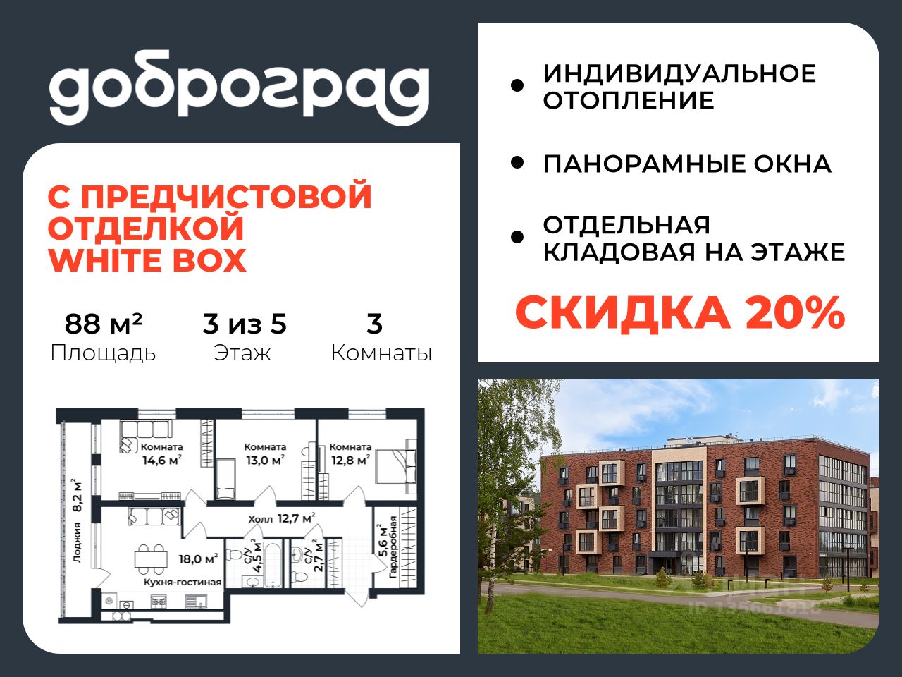 Продается 3-к квартира 88 кв.м. С ОТДЕЛКОЙ WHITE BOX в новом построенном доме по адресу: Владимирская область, Доброград, улица Долголетия, д.2, корп. 1.