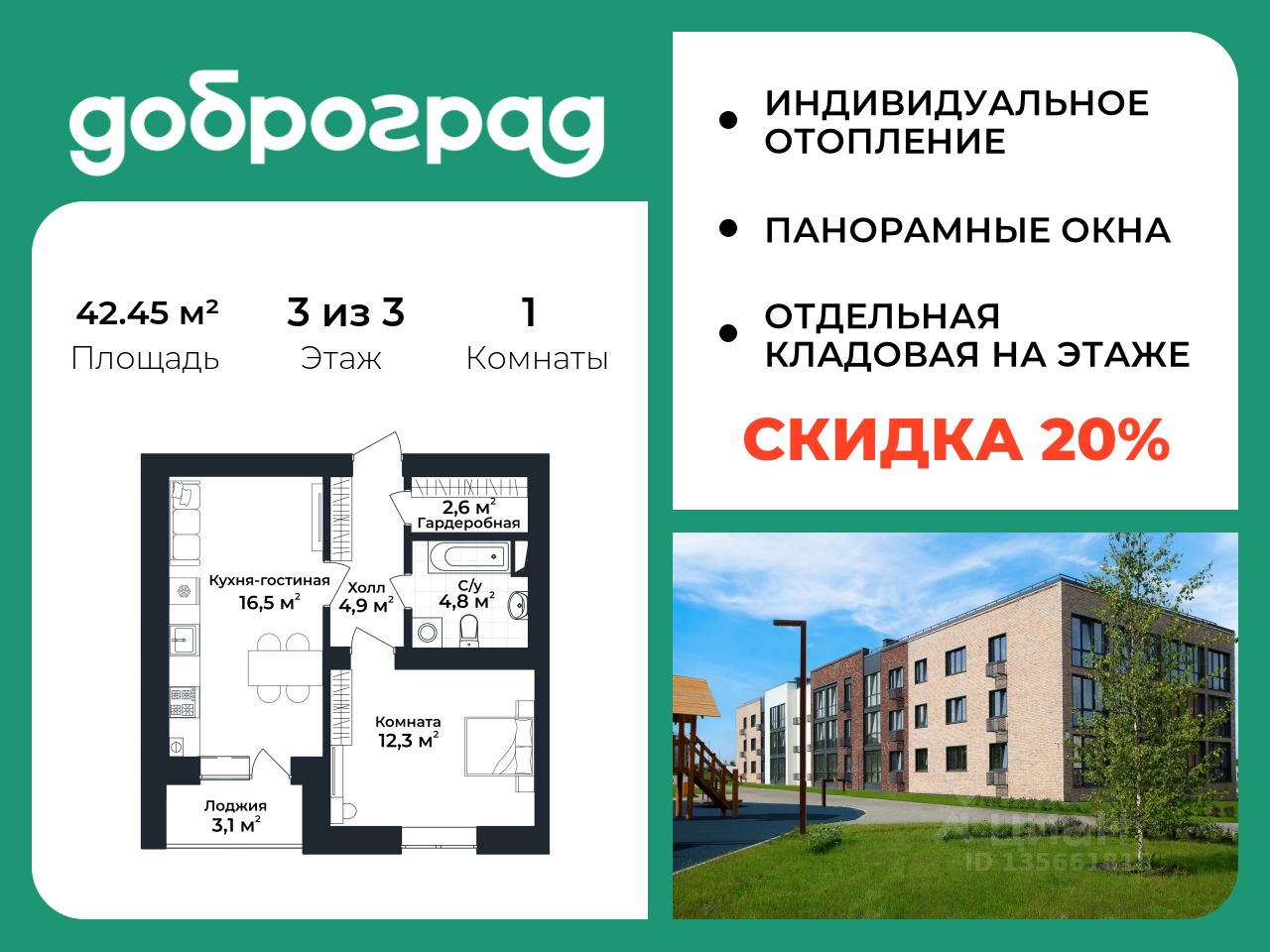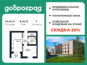 Продается 1-к квартира 42,45 кв.м. в новом построенном доме по адресу: Владимирская область, Доброград, улица Благополучия, д.1, корп. 1.