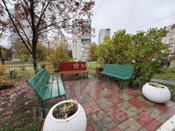 Очень уютный зеленый двор с местами для отдыха, с детской площадкой и большой парковкой.