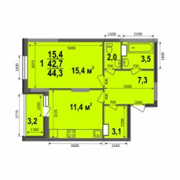 Однокомнатная квартира 44,3 кв.м - это одна из немногих 1-комнатных квартир с раздельным санузлом и гардеробной, кроме того, в просторной прихожей есть место под большой шкаф-купе. Выход на лоджию находится на кухне, жилая комната имеет площадь 15,4 кв.м.