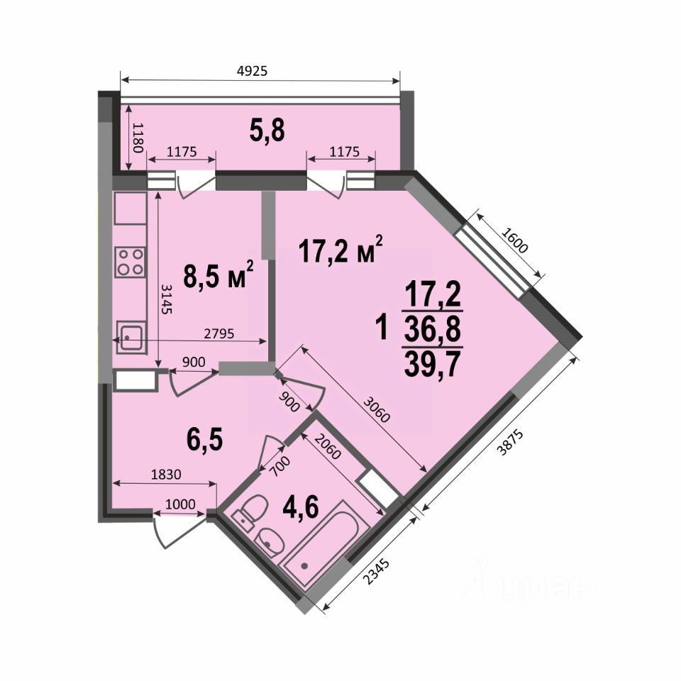 Однокомнатная квартира 39,7 кв.м - это большая квартира с жилой комнатой более 17 кв.м, лоджией с выходами из кухни и комнаты, совмещенным санузлом и уютной кухней.