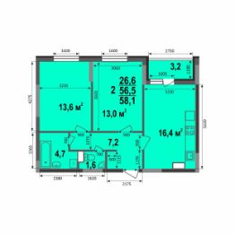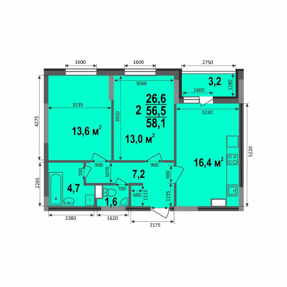 Классическая двухкомнатная квартира (58,1 кв.м) на одну сторону. В квартире большая кухня с выходом на лоджию, раздельный санузел, удобная прихожая с нишей для шкафа-купе и 2 спальни по 13 кв.м