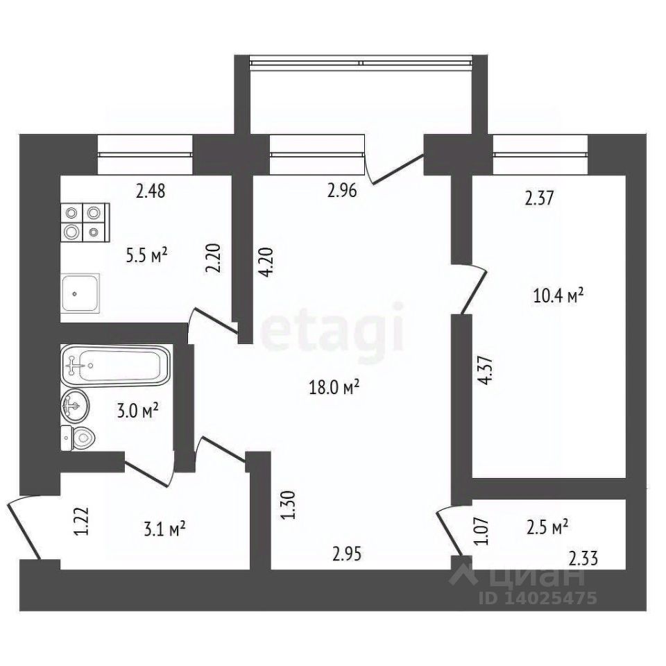 - общая площадь - 42,5кв.м;