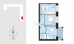 Квартира расположена на угловой стороне, комнаты изолированы, общая площадь позволяет комфортно разместить всю необходимую мебель. Жилая площадь составляет 33 кв. м, кухня — 14 кв. м.