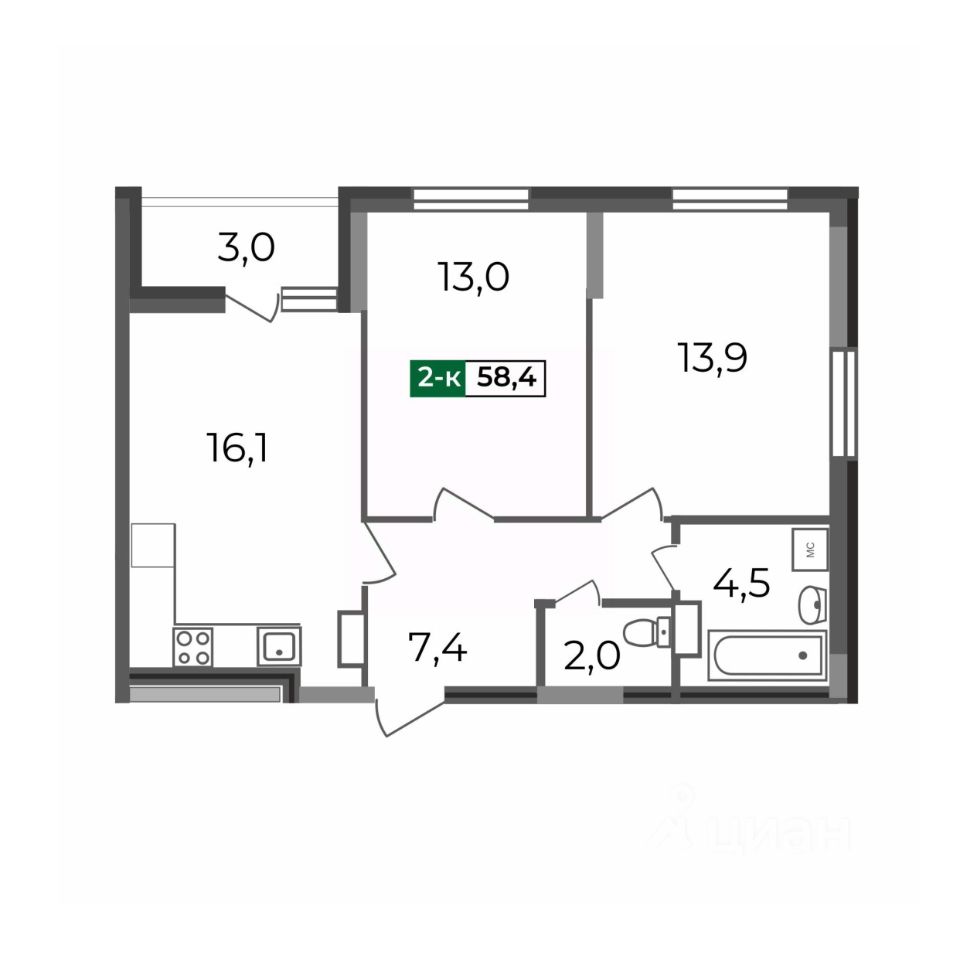2-комнатная квартира (58,9/58,4 кв.м) с большой кухней и раздельным санузлом в новом ЖК Смоленская 3А. В квартире 2 просторные спальни правильной формы, лоджия с выходом из кухни и удобная прихожая с нишей под шкаф-купе.