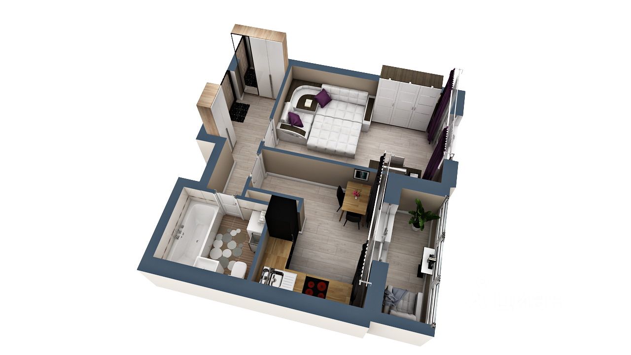 Однокомнатная квартира (38,7/39,2 кв.м) - это квартира с совмещенным санузлом, большой жилой комнатой и просторной прихожей. Окна квартиры выходят на внешнюю сторону дома. На кухне расположен выход на лоджию.