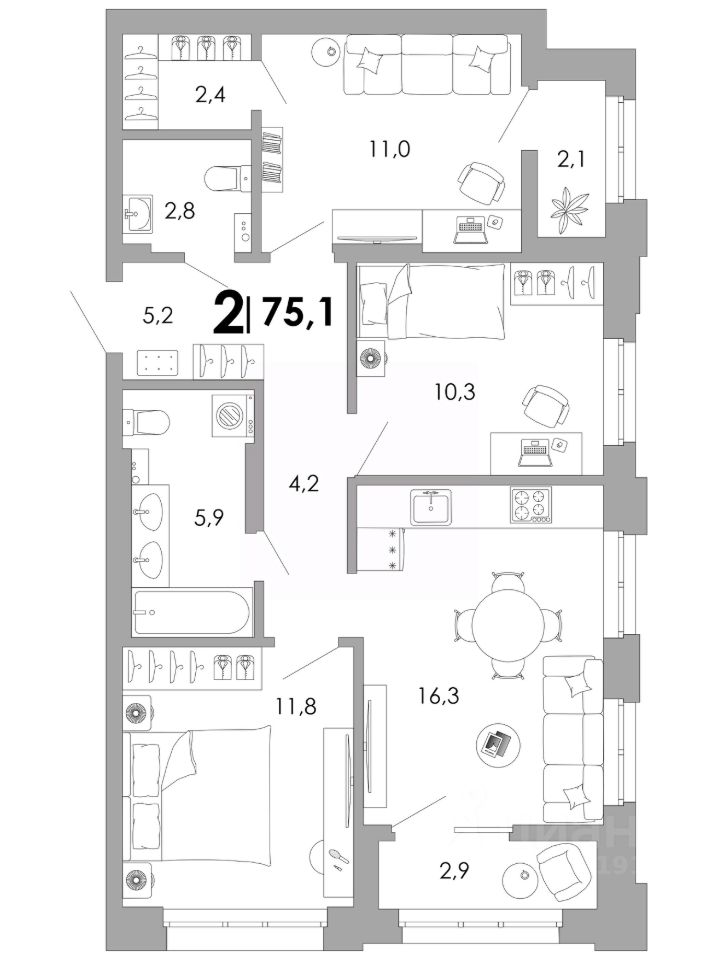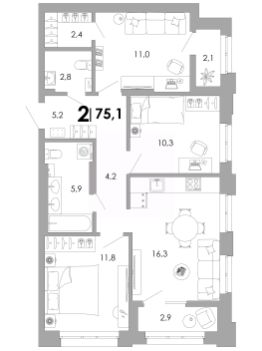 • Уникальные планировки с анфиладной или мастер-спальней, центральной кухней-гостиной, постирочной и гардеробной.