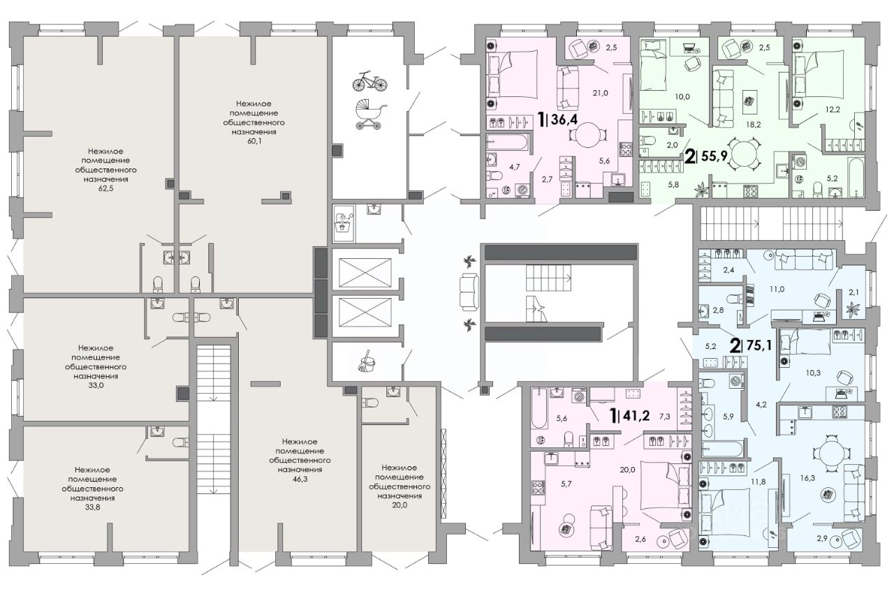 • Лаунж-зоны, площадки для питомцев, пространства для работы.