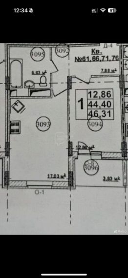 Общая площадь квартиры 46,30 кв.м., комната 12,9 кв.м., просторная большая кухня 17 кв.м.