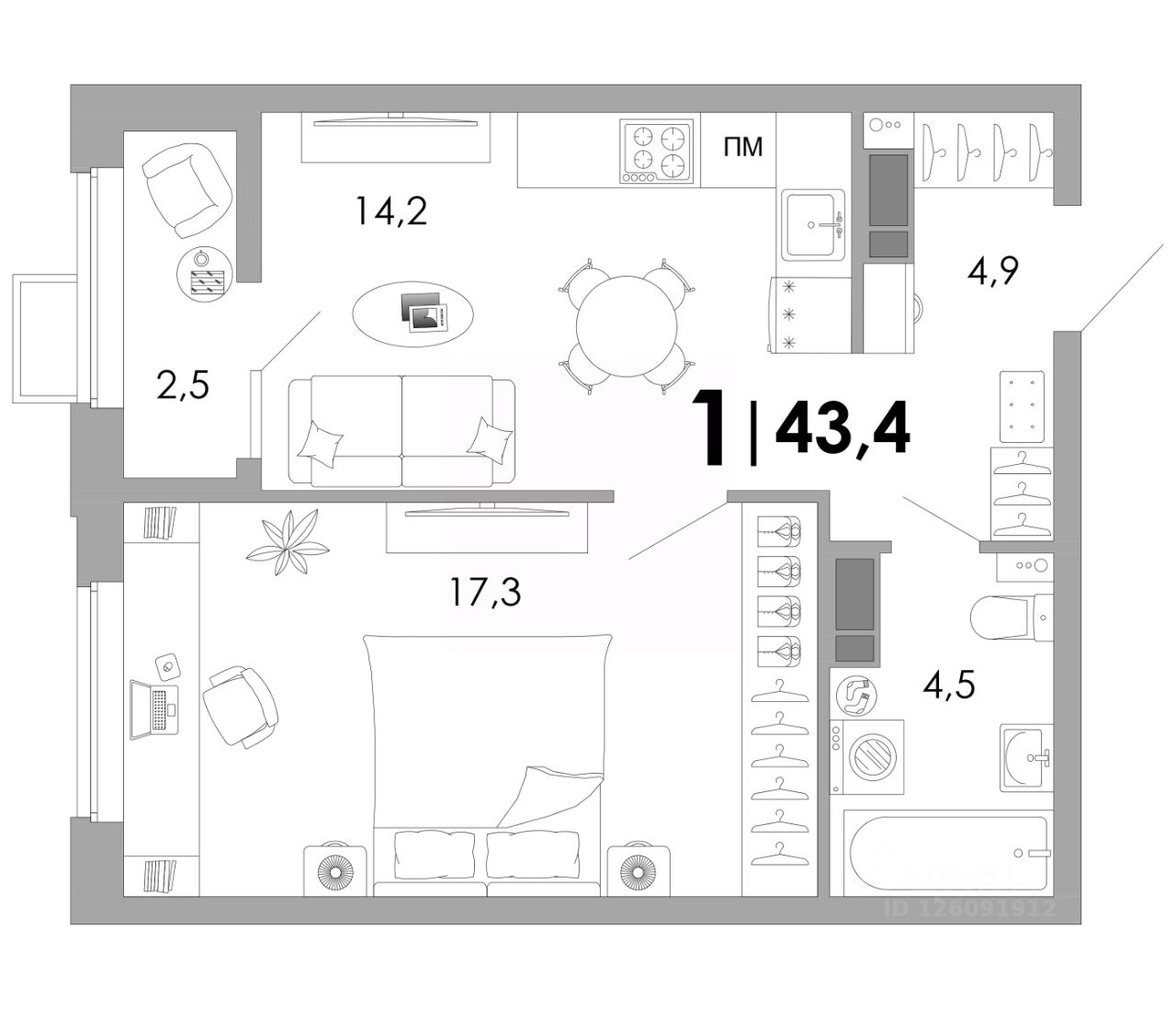 Общая площадь43,4 м²