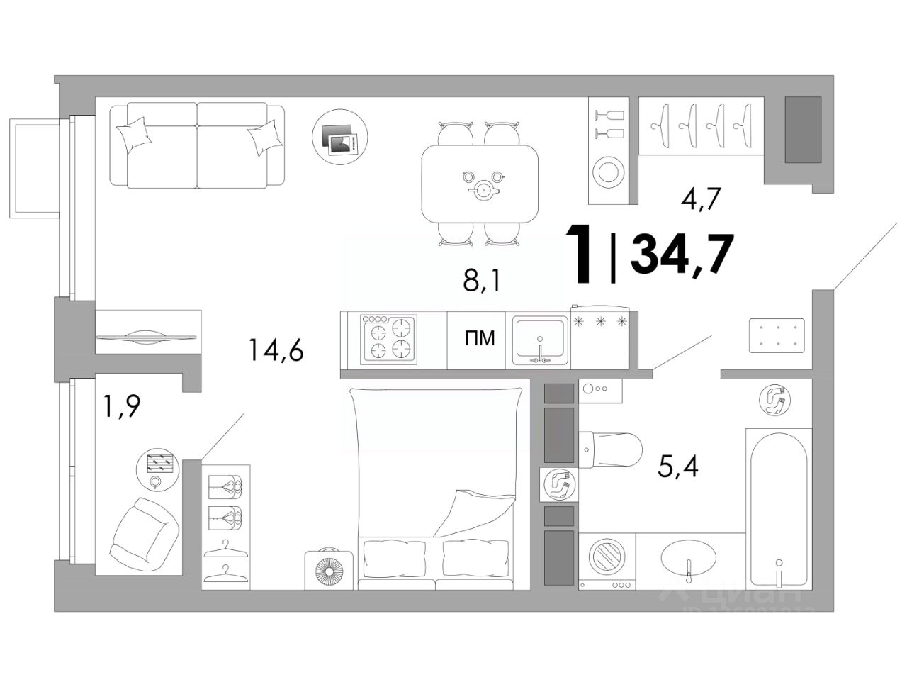 Общая площадь34,7 м²