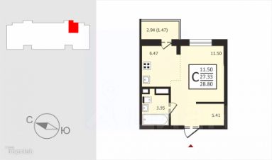 Арт. 126254755 На продажу выставлена студия 28.80 м.кв., в ЖК "Зарeчье пaрк" лоджия застекленная, совмещенный санузел