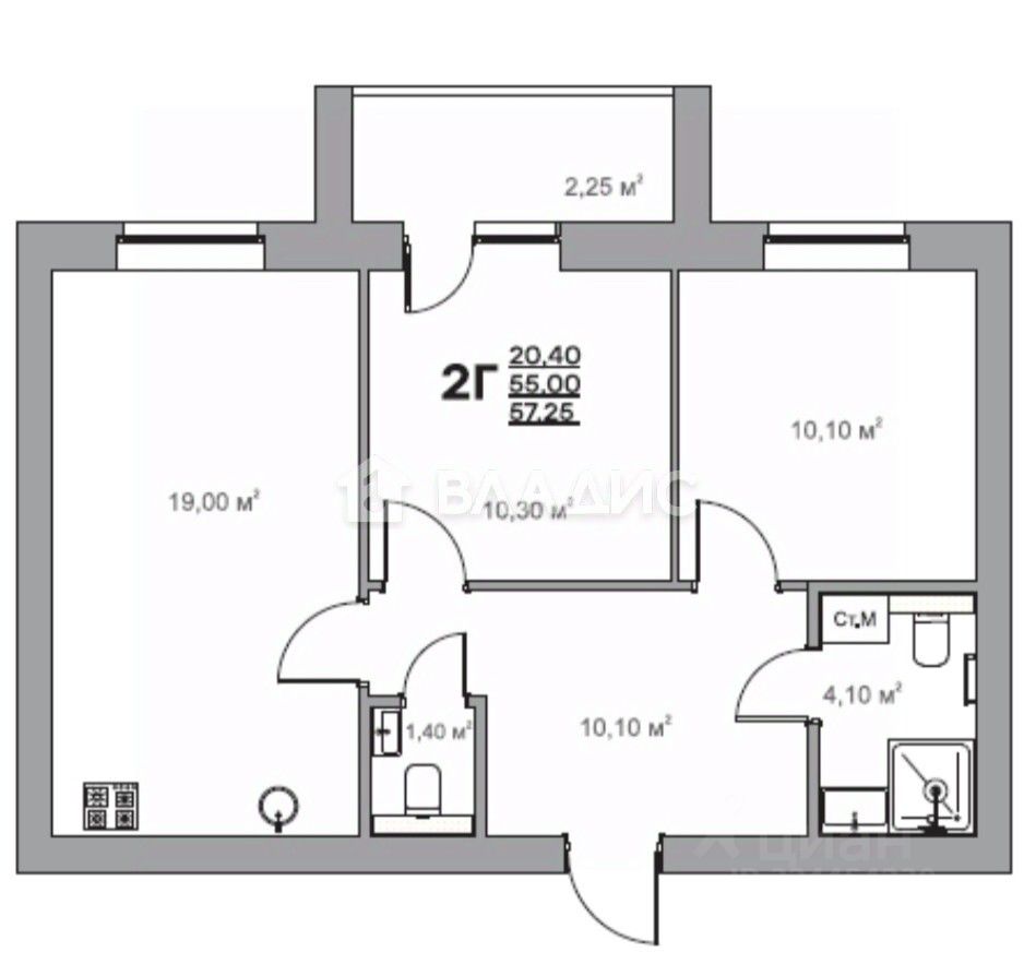 Преимуществом этой 2-комнатной квартиры стали 2 отдельные изолированные комнаты и объединенная с кухней гостиная общ.пл. 19 кв. м. Кухня-гостиная зонирована, на место для приготовления пищи, где можно установить кухонный гарнитур и обеденный стол, а также просторную ТВ-зону. Ещё одним преимуществом является, наличие 2 санузлов, площадью 4,1 кв.м. и 1,4 кв.м. Окна квартиры выходят во двор, балкон остеклен.