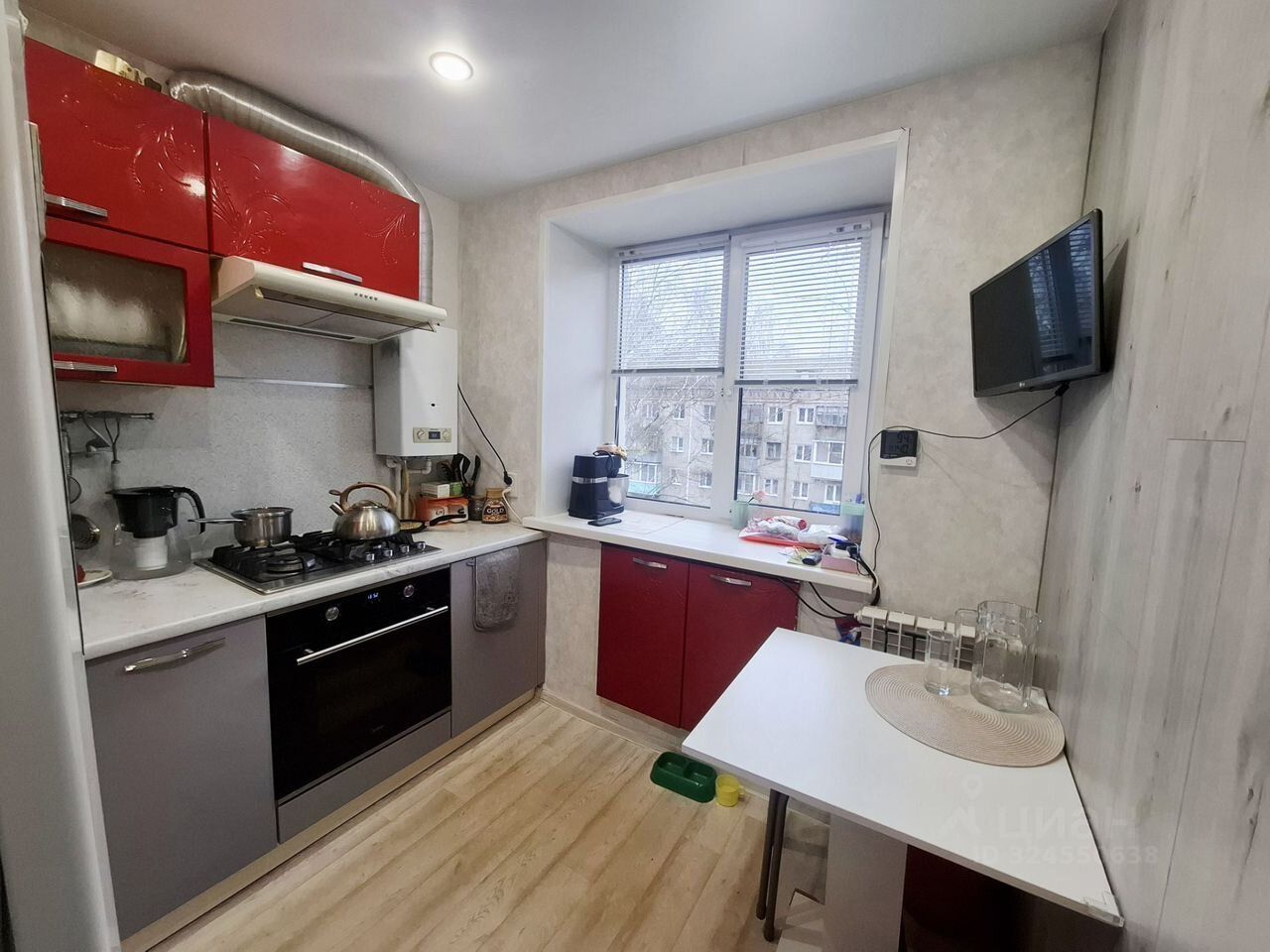 Остаётся кухонный гарнитур, очень вместительный шкаф в комнате, стенка в прихожей.