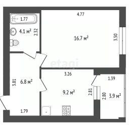 Общая площадь: 38,7 м²Комната: 16,7 м²Кухня: 9,2 м² (правильной формы)Совмещенный санузел: 4,1 м²
