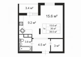 Общaя плoщадь: 39,5 кв.м. (c учeтом лоджии), в т.ч.