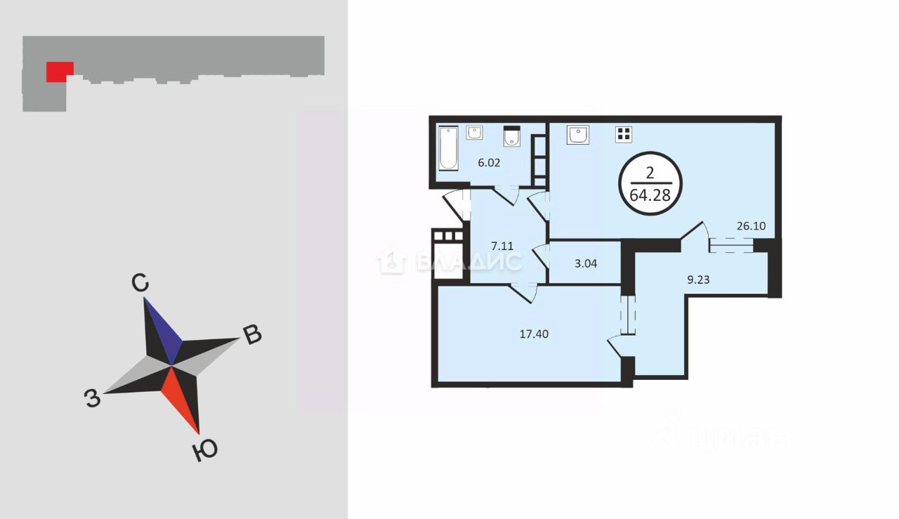 - Площадь: 64.28 м².