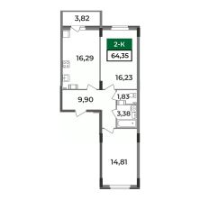 Современная 2-комнатная квартира-бабочка 64,35 кв.м. Кухня 16,29 кв.м просторная и функциональная. Кроме того, в коридоре предусмотрена ниша под шкаф-купе, что обеспечивает дополнительное место для хранения вашей одежды и вещей.Комнаты имеют правильную геометрическую форму, что облегчает размещение мебели и создает уютную атмосферу для отдыха и общения.