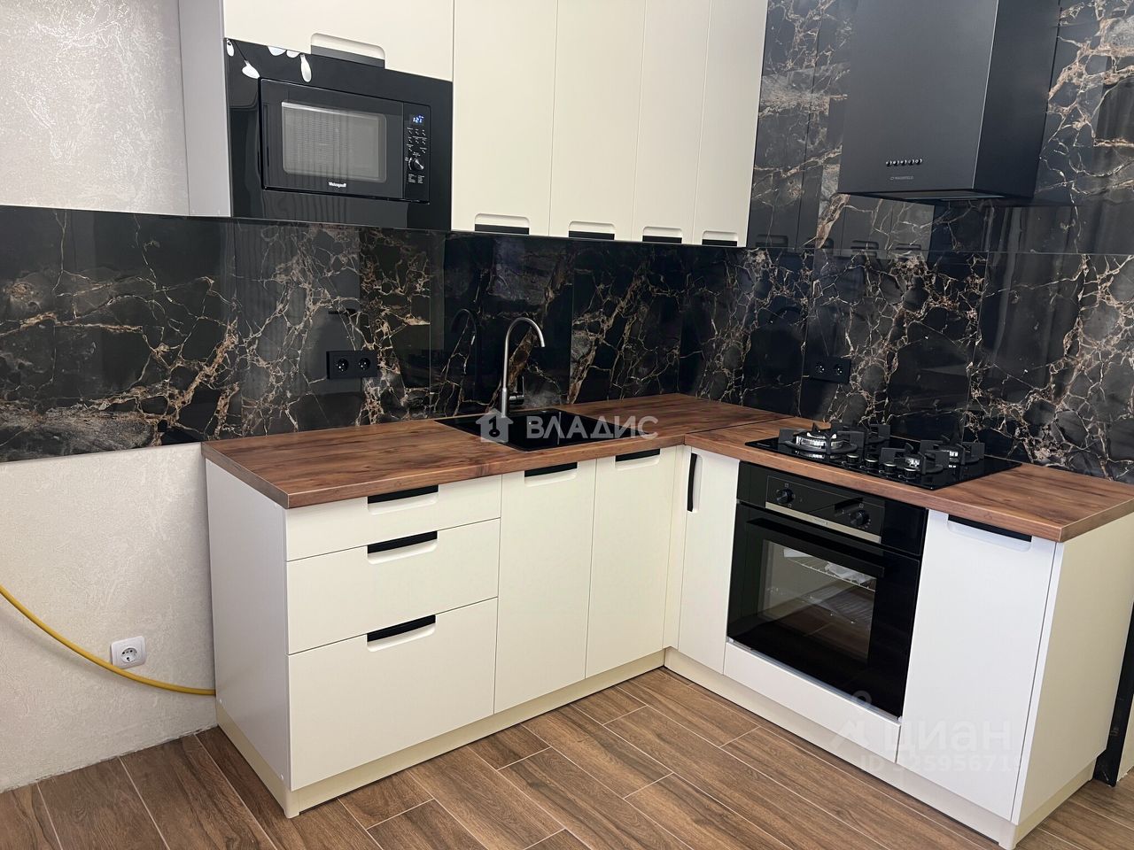 - встроенный кухонный гарнитур с бытовой техникой (газовая варочная панель, духовой шкаф, вытяжка, встроенная микроволновая печь