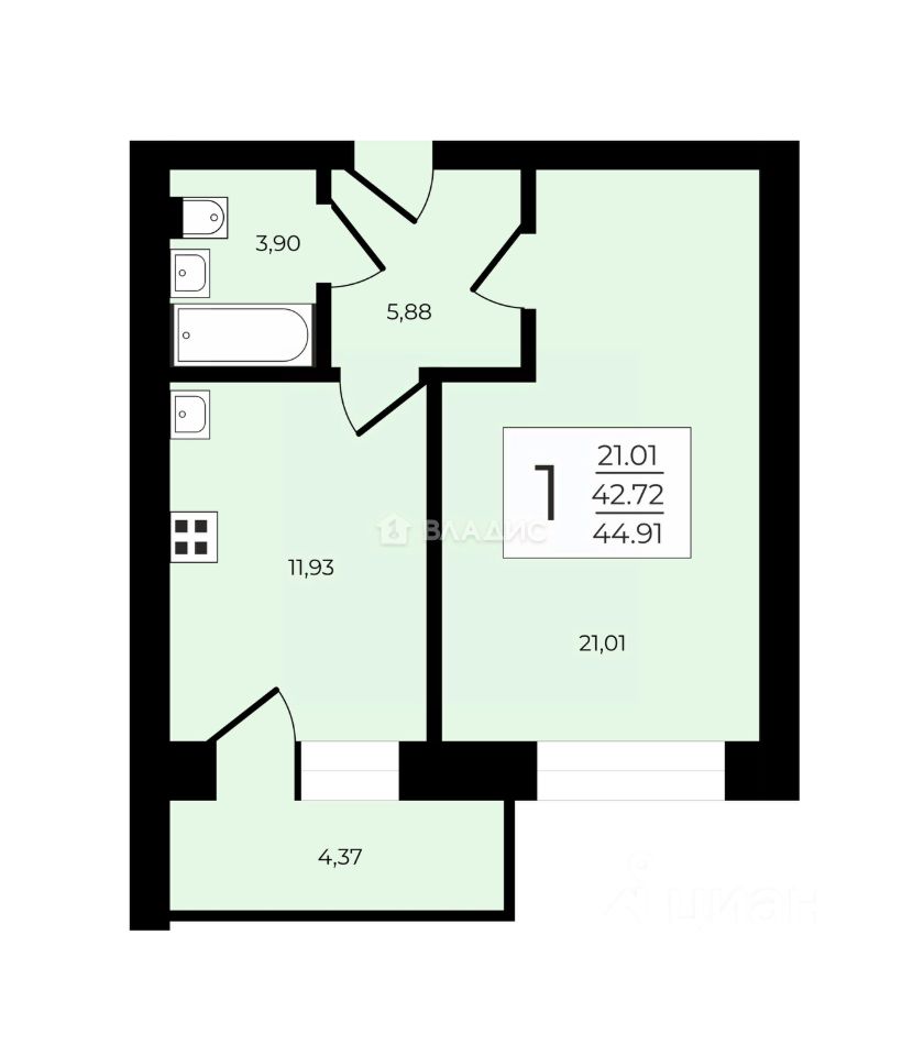 Общая площадь квартиры — 44,91 кв. м, из которых 21,01 кв. м приходится на жилую площадь, а 11,93 кв. м — на кухню. Есть лоджия и совмещённый санузел. Квартира без отделки, что даёт возможность воплотить любые дизайнерские решения.