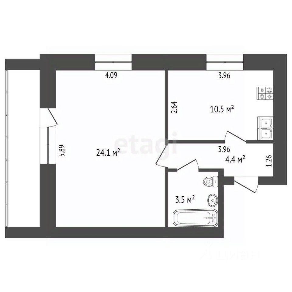 Общая площадь 42,5 кв. м. Удачная планировка — большая комната 24,1 кв.м. с выходом на застеклённую лоджию 6-ти метровую лоджию! Кухня правильной формы — 10,5 кв.м.!!!