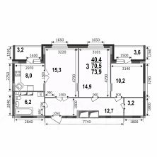 Просторная трехкомнатная квартира 73,9 кв.м в строящемся доме ЖК Сталинградский бульвар 7 в новом смарт-квартале VERIZINO life. Классическая планировка квартиры с кухней-гостиной, гардеробной и двумя лоджиями.