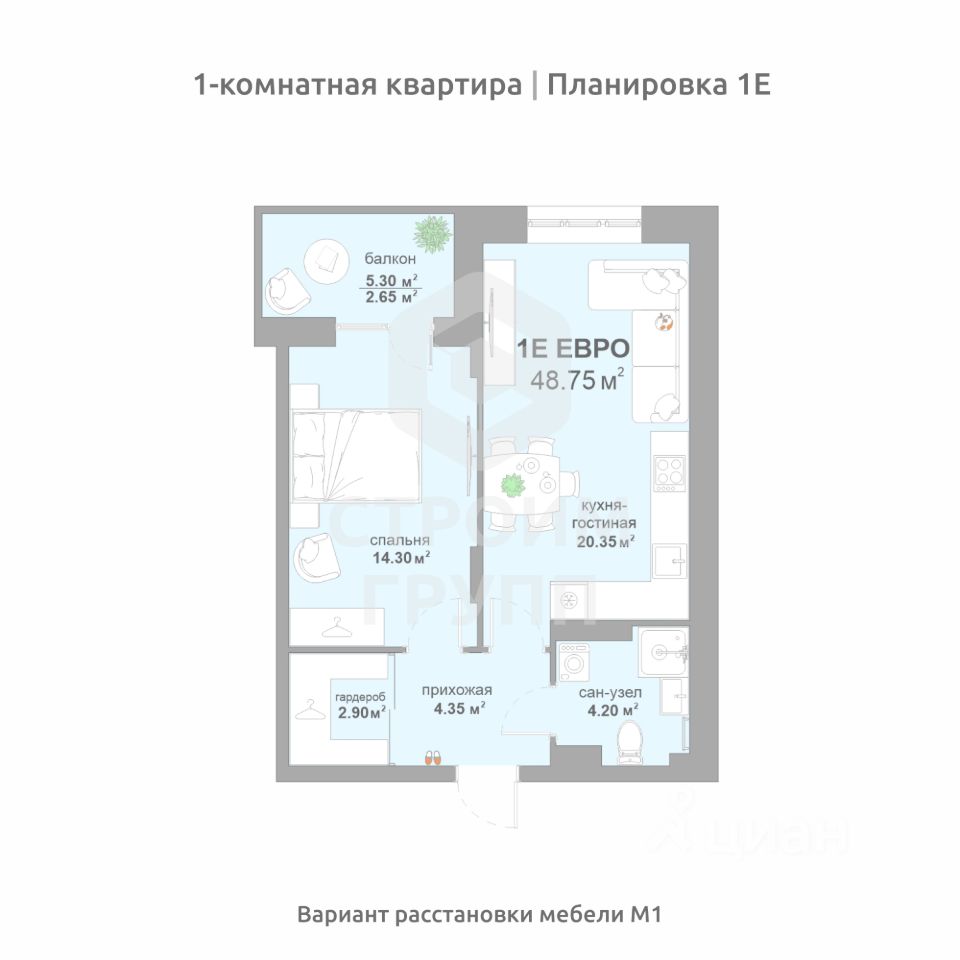 Общая площадь48,75 м²