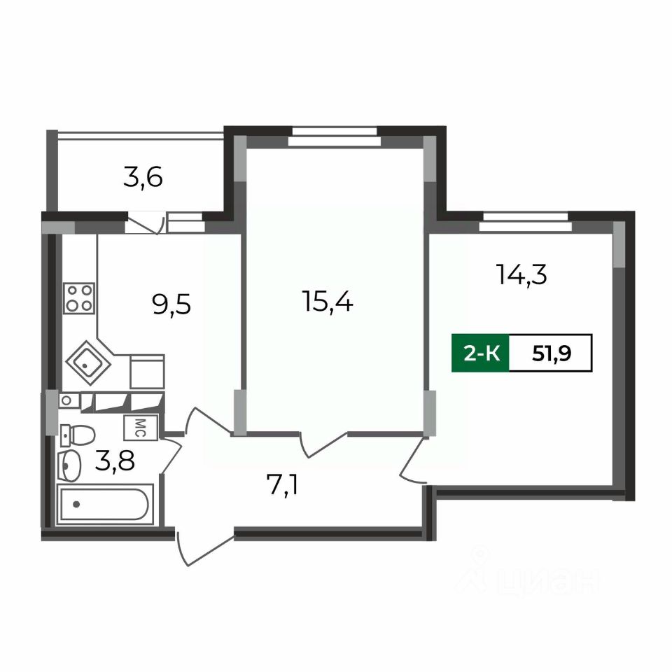 Плюсы: квадратная кухня почти 9,5 кв.м с выходом на лоджию, просторные раздельные жилые комнаты 14/15 кв.м, совмещенный санузел, функциональная прихожая с местом под шкаф-купе