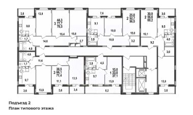Две раздельные комнаты на с-з и ю-в, кухня 9,5 кв.м и просторный коридор с гардеробной и с выделенным местом под шкаф-купе. Классическая планировка семьи из 3-4 человек.