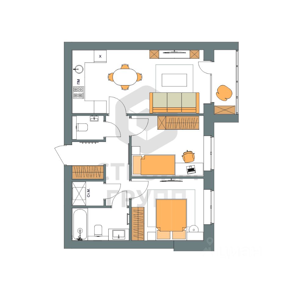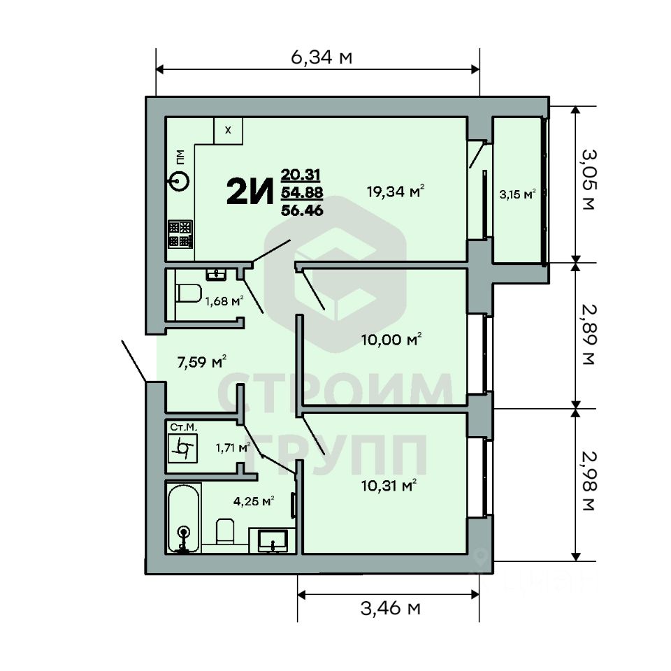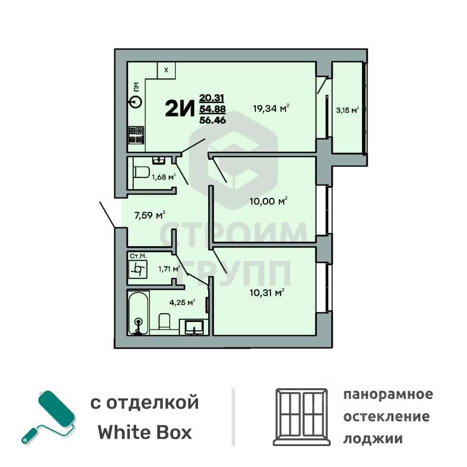 Особенностью этой двухкомнатной квартиры является объединенная с кухней гостиная общей площадью больше 19 квадратных метров! Помещение разделено на зоны для приготовления пищи, где можно установить кухонный гарнитур и большой обеденный стол для всей семьи, и ТВ-зону, где поместится хороший просторный диван. Из комнаты имеется выход на просторную лоджию площадью 3,15 квадратных метров. При сдаче дома лоджия будет остеклена! При такой планировке совмещенной кухни и гостиной, неоспоримым преимуществом этой двухкомнатной квартиры являются две отдельные комнаты, площадью 10 квадратных метров. Одну из них предполагается использовать под спальную комнату, где можно установить широкую кровать или раскладной диван и вместительный шкаф для одежды. Вторую комнату можно использовать в качестве детской или кабинета. Интересным и полезным решением в этой двухкомнатной квартире стали два санузла! Один - полноценный, площадью 4,25 квадратных метра, где можно установить раковину, ванну и унитаз, а второй - небольшой, площадью 1,68 квадратных метров, с отдельным унитазом. Для семьи с детьми - очень актуальное решение. Также рядом с большим санузлом есть отдельное помещение площадью 1,7 квадратный метра, которое можно использовать в качестве постирочной комнаты или гардероба. В большом коридоре с холлом площадью 7,6 квадратных метров при входе в квартиру предусмотрено место для установки вместительного шкафа для хранения вещей. Прихожая изолирована, благодаря чему грязь и песок с улицы не попадут в жилое помещение. Доступны такие способы покупки, как наличные, ипотека от ведущих банков (в т.ч. все программы с субсидиями и господдержка), ипотека со снижением ставки за счёт застройщика, рассрочка до 2 лет напрямую от застройщика. В цену квартиры сразу входит ремонт в формате White Box с гарантией на все работы!