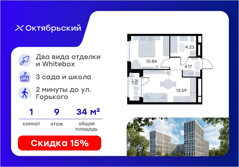 Продается 1-комн. квартира на 9-м этаже в строящемся проекте комфорт-класса Октябрьский. Общая площадь лота составляет 34,11 кв. м, из которых 10,84 кв. м отведено под жилую и 13,69 кв. м под кухонную зону. Номер квартиры - 91.