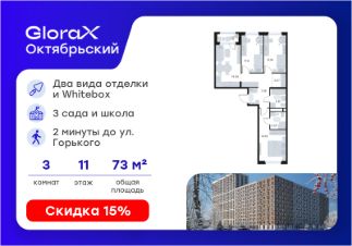 Продается 3-комн. квартира на 11-м этаже в строящемся проекте комфорт-класса GloraX Октябрьский. Общая площадь лота составляет 73,11 кв. м, из которых 36,92 кв. м отведено под жилую и 14,28 кв. м под кухонную зону. Номер квартиры - 427.