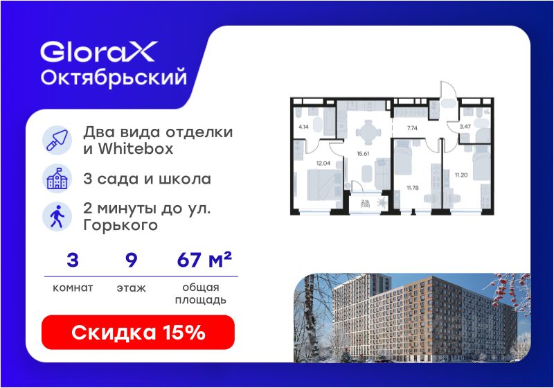 Продается 3-комн. квартира на 9-м этаже в строящемся проекте комфорт-класса GloraX Октябрьский. Общая площадь лота составляет 67,06 кв. м, из которых 35,02 кв. м отведено под жилую и 15,61 кв. м под кухонную зону. Номер квартиры - 413.