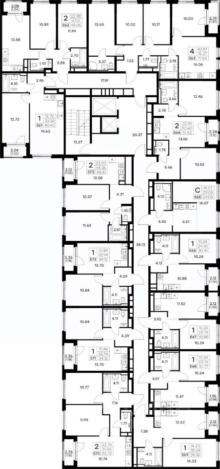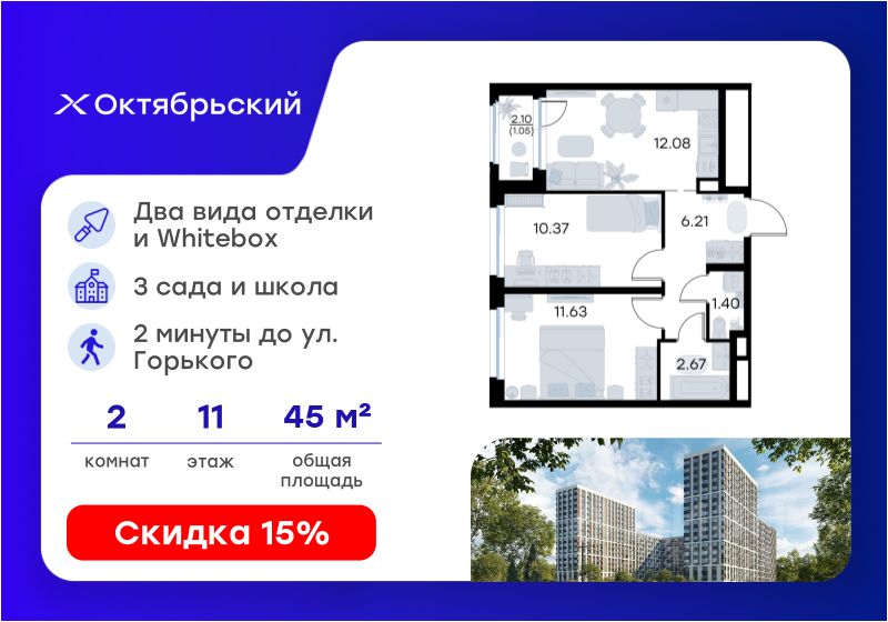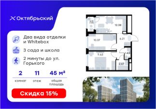 Продается 2-комн. квартира на 11-м этаже в строящемся проекте комфорт-класса Октябрьский. Общая площадь лота составляет 45,41 кв. м, из которых 22,00 кв. м отведено под жилую и 12,08 кв. м под кухонную зону. Номер квартиры - 573.