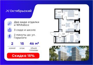 Продается 2-комн. квартира на 15-м этаже в строящемся проекте комфорт-класса Октябрьский. Общая площадь лота составляет 46,46 кв. м, из которых 21,76 кв. м отведено под жилую и 12,69 кв. м под кухонную зону. Номер квартиры - 750.