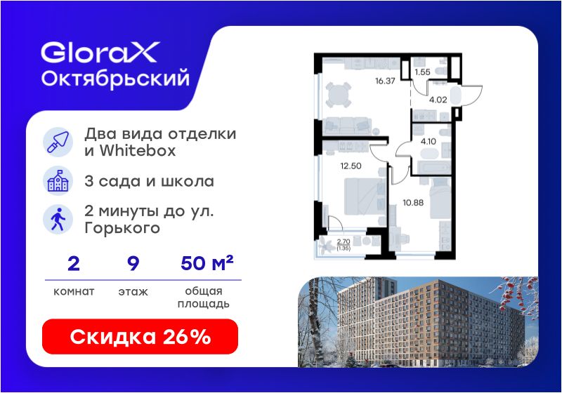 Отличительное преимущество GloraX Октябрьский — видовые квартиры на верхних этажах. Все помещения сдаются уже с предчистовой отделкой. Вы сможете сразу переехать и начать жить в новом доме.