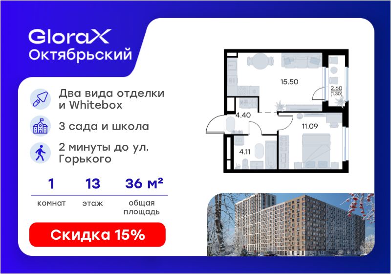 Продается 1-комн. квартира на 13-м этаже в строящемся проекте комфорт-класса GloraX Октябрьский. Общая площадь лота составляет 36,40 кв. м, из которых 11,09 кв. м отведено под жилую и 15,50 кв. м под кухонную зону. Номер квартиры - 145.