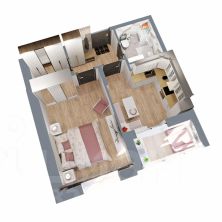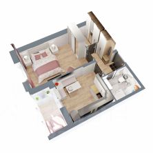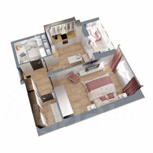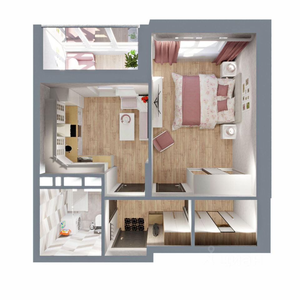 Это квартира с гардеробной, небольшой кухней и просторной жилой комнатой 15 кв.м. Лоджия с выходом из кухни и вместительный санузел.
