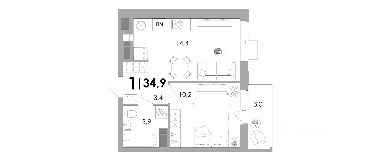 Уникaльная планировка данной 1комнатной квартиры cо светлой cпальнeй и выходом на лоджию, просторной кухней-гостиной.