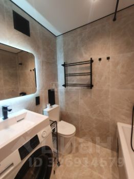 * Функциональный санузел: Выполненный керамогранитом, с ванной, зеркалом с подсветкой и стиральной машиной Haier — от проверенных брендов.