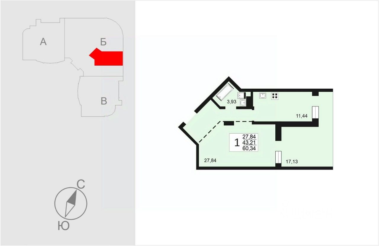 Общая площадь 43.21 кв.м.