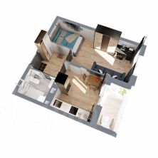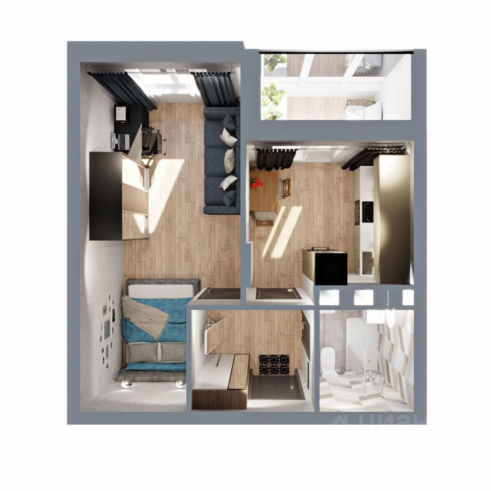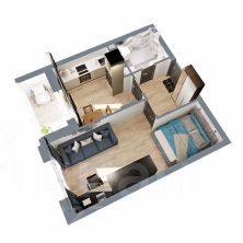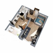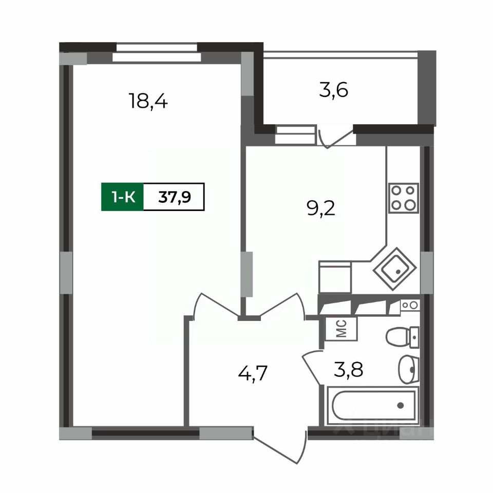 Классическая однушка с совмещенным санузлом, функциональной прихожей, небольшой кухней с выходом на лоджию и большой жилой комнатой, в которой при желании можно организовать гардеробную (предусмотрена ниша).