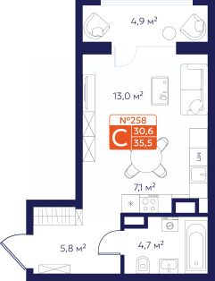Продается 1-комнатная квартира 258 в Квартале "Новаторов" комфорт-класса.
