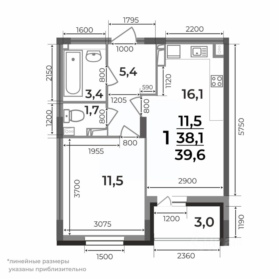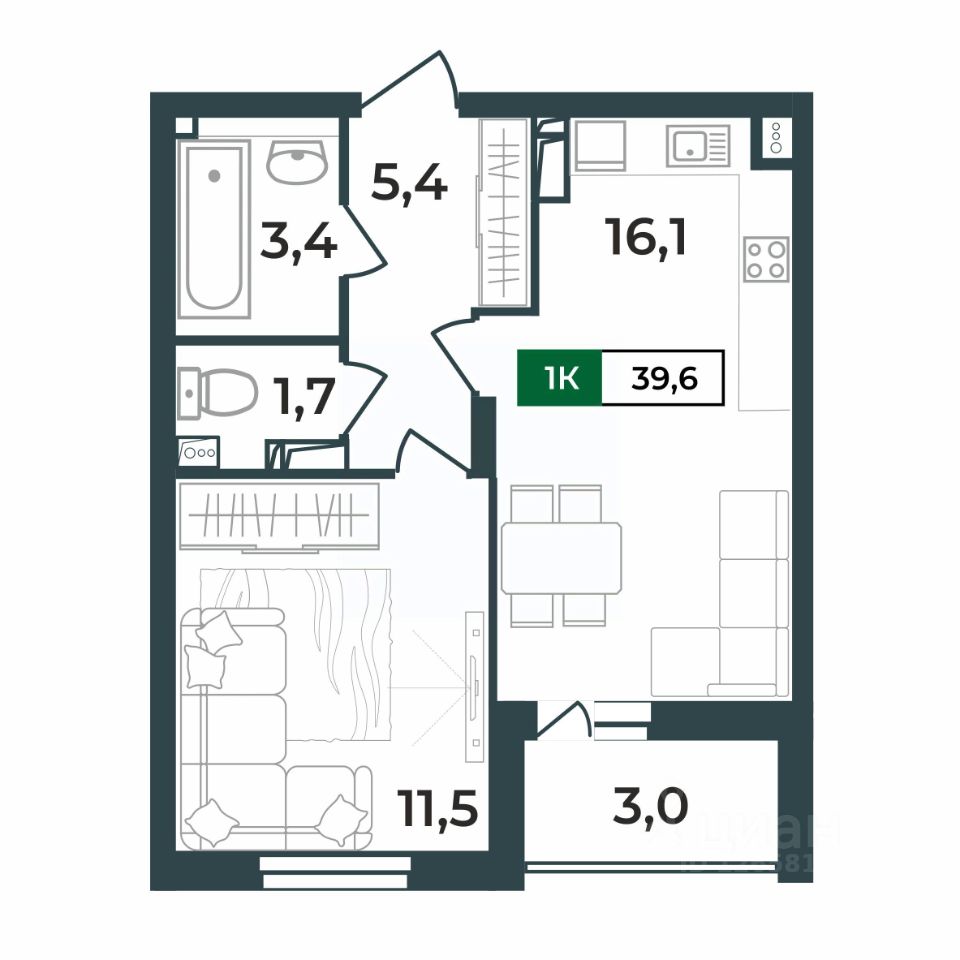 Общая площадь39,6 м²