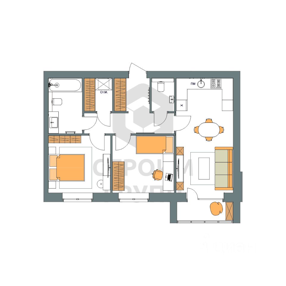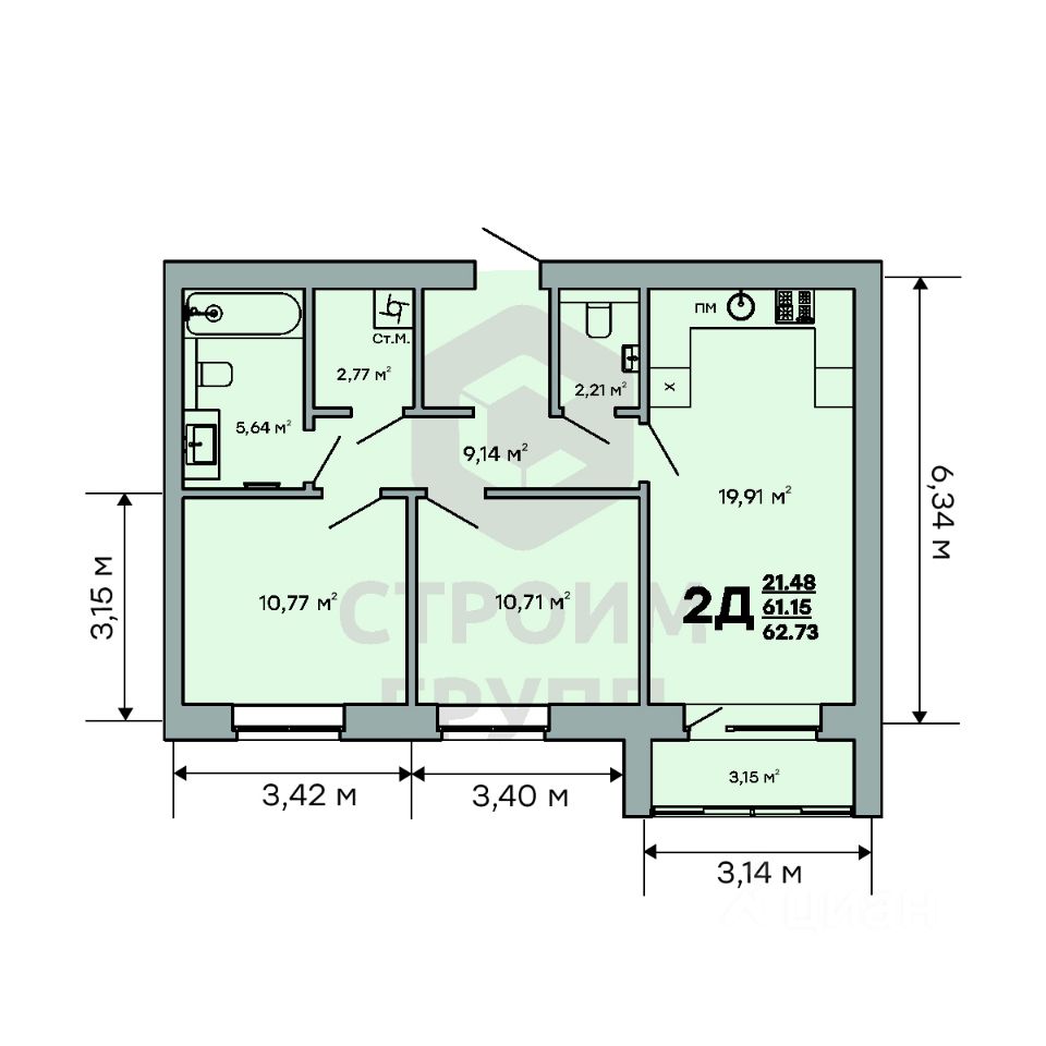 Особенностью этой двухкомнатной квартиры является объединенная с кухней гостиная общей площадью почти 20 квадратных метров! Помещение разделено на зоны для приготовления пищи, где можно установить кухонный гарнитур и большой обеденный стол для всей семьи, и ТВ-зону, где поместится хороший просторный диван. Из комнаты имеется выход на просторную лоджию площадью 3,15 квадратных метра. При сдаче дома лоджия будет остеклена! При такой планировке совмещенной кухни и гостиной, неоспоримым преимуществом этой двухкомнатной квартиры являются две отдельные комнаты площадью почти 11 квадратных метров каждая. Одну из них можно использовать под спальную комнату с размещением там широкой кровати или раскладного дивана. Предусмотрено место под вместительный шкаф для одежды. Вторую комнату можно использовать в качестве детской или кабинета. Интересным и полезным решением в этой двухкомнатной квартире стали два санузла! Один - полноценный, площадью 5,6 квадратных метра, где можно установить раковину, ванну и стиральную машину, а второй - небольшой, площадью 2,2 квадратных метра, с отдельными унитазом и раковиной. Для семьи с детьми - очень актуальное решение. Обратите внимание - рядом с большим санузлом есть отдельное помещение площадью почти 2,8 квадратных метра, которое можно использовать в качестве постирочной комнаты или гардероба. Просторная прихожая является непроходной. Изолированность прихожей позволяет держать в чистоте остальные помещения квартиры грязь с улицы не будет разноситься по комнатам. Доступны такие способы покупки, как наличные, ипотека от ведущих банков (в т.ч. все программы с субсидиями и господдержка), ипотека со снижением ставки за счёт застройщика, рассрочка до 2 лет напрямую от застройщика. В цену квартиры сразу входит ремонт в формате White Box с гарантией на все работы!