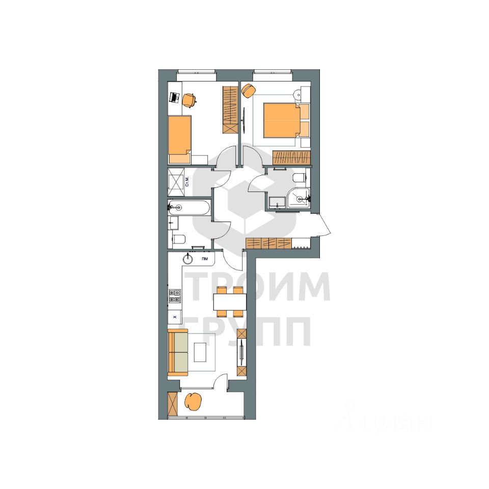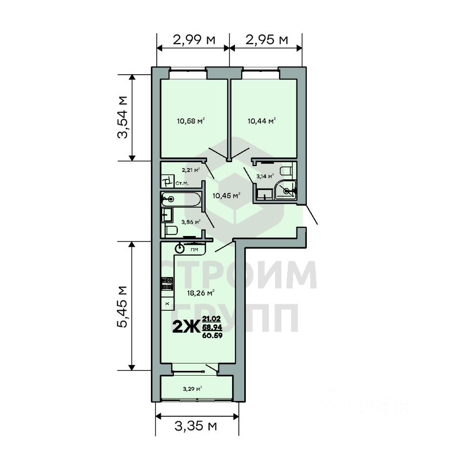 Особенностью этой двухкомнатной квартиры является объединенная с кухней гостиная общей площадью 21 квадратный метр! Помещение разделено на зоны для приготовления пищи, где можно установить кухонный гарнитур и большой обеденный стол для всей семьи, и ТВ-зону, где поместится хороший просторный диван. Из кухни имеется выход на просторную лоджию площадью 3,3 квадратных метра. При сдаче дома лоджия будет остеклена! При такой планировке совмещенной кухни и гостиной, неоспоримым преимуществом этой двухкомнатной квартиры являются две отдельные комнаты. Одну из них (10,6 кв. м) можно использовать под спальную комнату, где можно установить широкую кровать или раскладной диван и вместительный шкаф для одежды. Вторую комнату (10, 44 кв. м) можно использовать в качестве детской или кабинета. Интересным и полезным решением в этой двухкомнатной квартире стали два полноценных санузла! В первом предусмотрено место для ванной, во втором для душевой кабины. Для семьи с детьми - очень актуальное решение. Обратите внимание - рядом с большим санузлом есть отдельное помещение площадью 2,2 квадратных метра, которое можно использовать в качестве постирочной комнаты или гардероба. Просторная прихожая является непроходной. Изолированность прихожей позволяет держать в чистоте остальные помещения квартиры грязь с улицы не будет разноситься по комнатам. Доступны такие способы покупки, как наличные, ипотека от ведущих банков (в т.ч. все программы с субсидиями и господдержка), ипотека со снижением ставки за счёт застройщика, рассрочка до 2 лет напрямую от застройщика. В цену квартиры сразу входит ремонт в формате White Box с гарантией на все работы