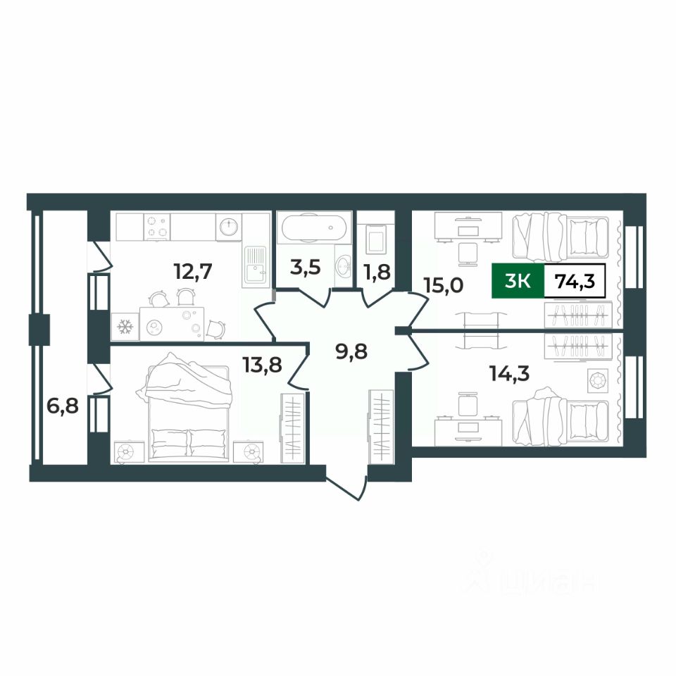 74,3 м²