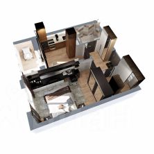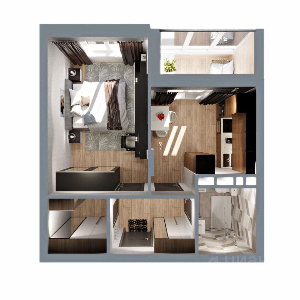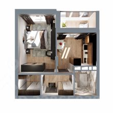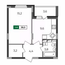 Это квартира с гардеробной, небольшой кухней и просторной жилой комнатой 15 кв.м. Лоджия с выходом из кухни и совмещенный санузел.