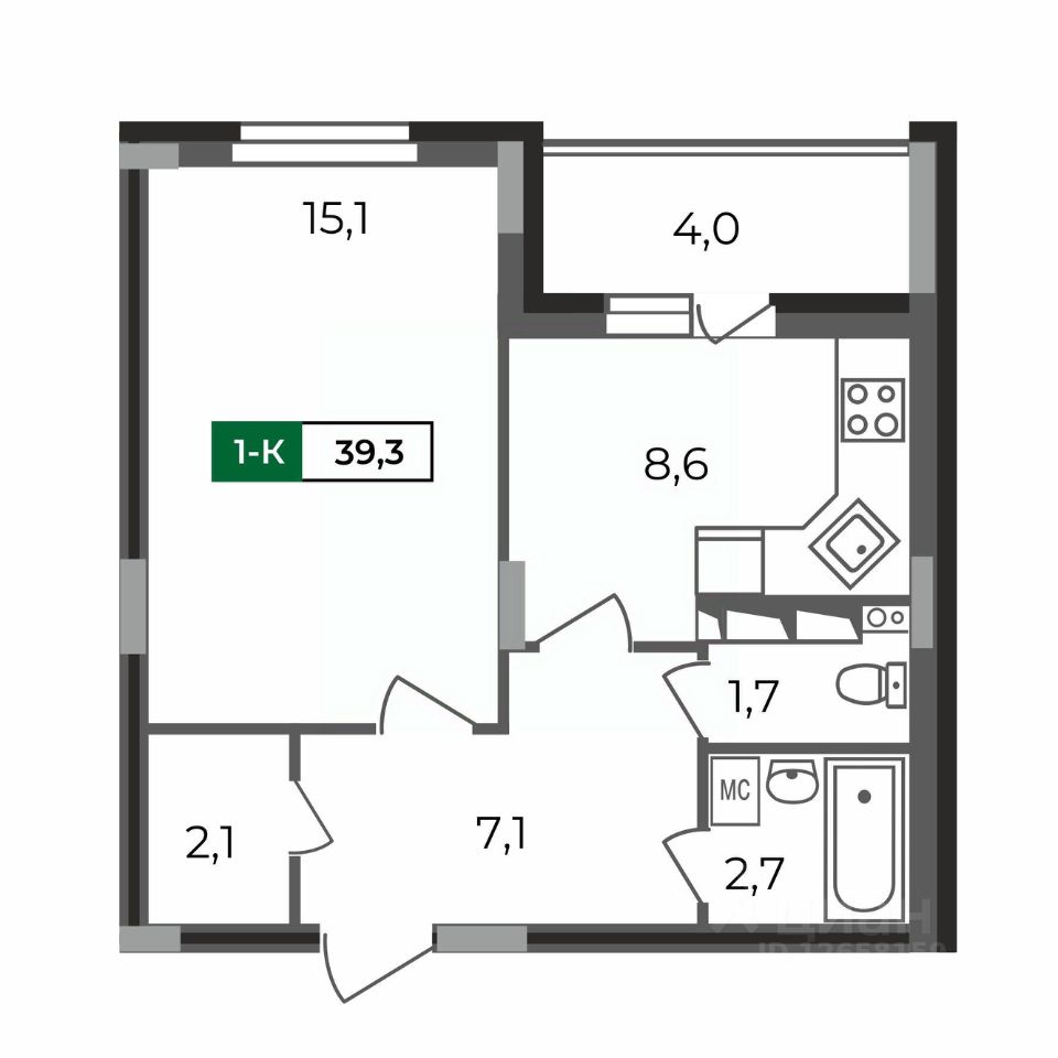 Это квартира с гардеробной, небольшой кухней и просторной жилой комнатой 15 кв.м. Лоджия с выходом их кухни и раздельный санузел.