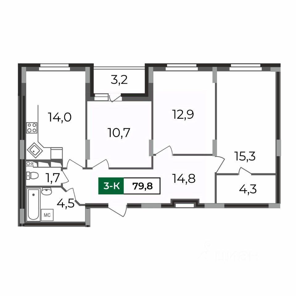 Три уютных спальни: 11 кв.м с выходом на лоджию, 13 кв.м и 15 кв.м спальня с гардеробной, вместительная кухня 14 кв.м, раздельный санузел и функциональный коридор.Черновая отделка, гарантия на дом 5 лет.